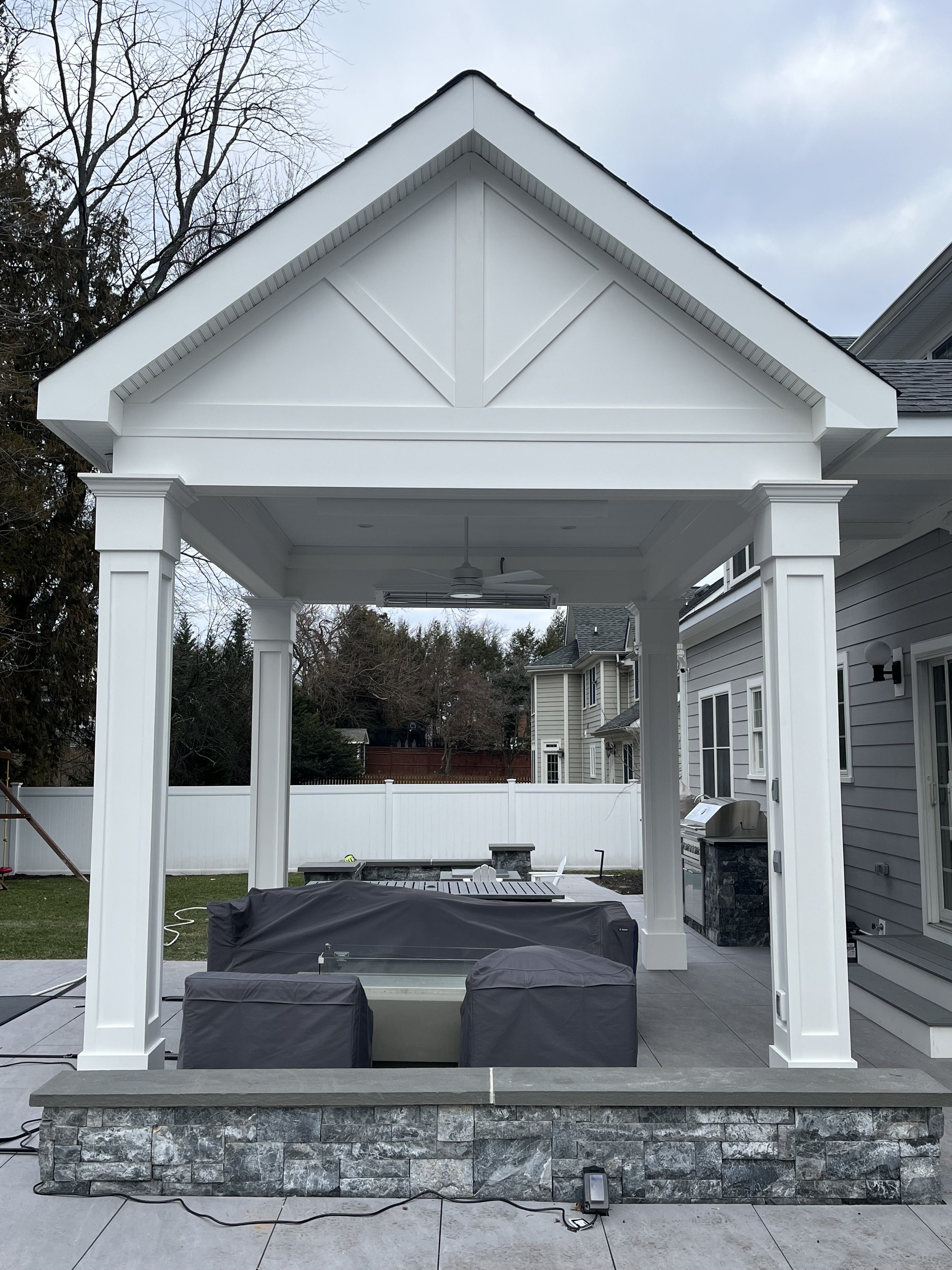 Backyard patio with a white pergola, outdoor furniture covered with gray covers, a granite counter with a built-in grill, and a white fence in the background.